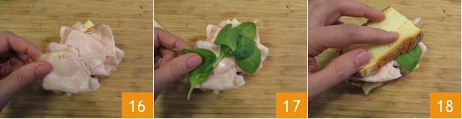 les tranches de dinde 16 et terminez par les jeunes pousses d'épinard 17. Refermez enfin avec la dernière tranche de pain 18.