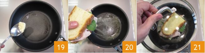 Faites fondre une noix de beurre dans une petite poêle antiadhésive à feu moyen-doux 19 et, lorsque la poêle est suffisamment chaude, ajoutez les sandwichs 20. Faites-les griller environ 3 minutes d'un côté en les gardant couverts 21,