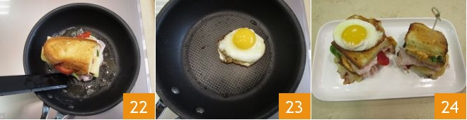 à mi-cuisson, retournez-les et poursuivez pendant 2 minutes supplémentaires, toujours couverts 22. Quand les sandwichs seront prêts, mettez-les de côté et, dans la même poêle encore graissée, cuisez les œufs pendant une à deux minutes 23. Coupez en deux les deux pains et posez vos œufs au plat sur les deux moitiés de vos madame club sandwich — voilà, ils sont prêts à être dégustés : bon appétit 24 !