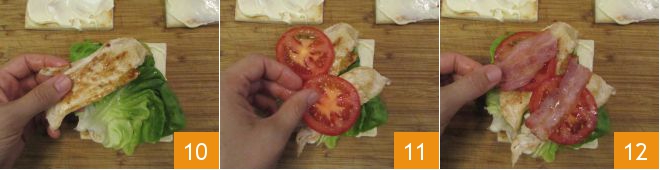 Ajoutez deux tranches de dinde 10, deux tranches de tomate 11 et une tranche de bacon coupée en deux 12.