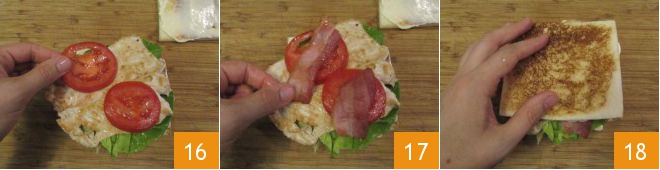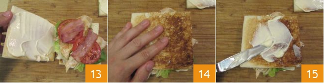 Répétez en ajoutant la feuille de laitue, les tranches de viande, les tomates 16 et le bacon 17. Déposez la dernière tranche de pain, toujours avec la mayonnaise en contact avec les ingrédients 18. Procédez de la même manière pour préparer le deuxième Club Sandwich.