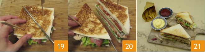 Piquez les coins du sandwich avec deux cure-dents 19. Coupez en diagonale afin d'obtenir deux moitiés de Club Sandwich 20 et servez avec des chips et des sauces selon votre goût 21 !
