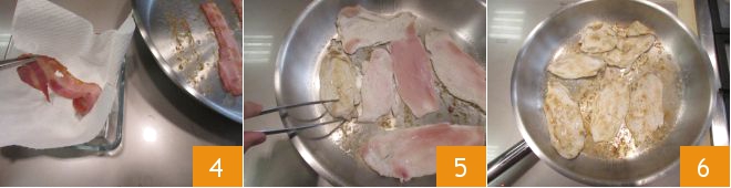 Une fois cuites et bien dorées, laissez-les refroidir en les égouttant sur du papier absorbant 4. Dans la même poêle, vous pouvez cuire les tranches de dinde pendant 2-3 minutes au total, en les retournant 5. Une fois prêtes 6, laissez-les tiédir.