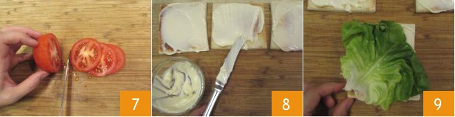 Lavez et coupez les tomates en fines tranches 7, puis lavez et essuyez les feuilles de laitue. Vous avez tous les ingrédients pour monter le club sandwich : placez les 6 tranches de pain sur la planche et tartinez un côté de chacune avec de la mayonnaise 8. Déposez sur une tranche de pain la laitue en contact avec la mayonnaise 9.