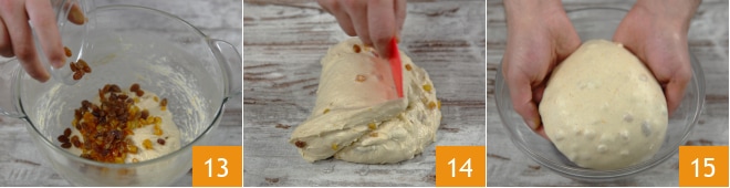 À ce stade, ajoutez les fruits confits coupés et les raisins secs préalablement trempés dans le jus d'orange et égouttés 13. Pétrissez encore quelques minutes jusqu'à bien incorporer tous les ingrédients. Transférez la pâte sur un plan de travail bien beurré et, à l'aide d'une corne, donnez des plis 14. Avec les mains beurrées, prenez la pâte et mettez-la dans un bol 15.