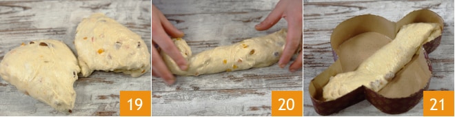 et, à l'aide de la corne, divisez-la en deux parties égales 19. Élargissez l'une des deux portions en l'étirant avec les mains, puis formez un cylindre en la roulant 20. Placez-la à l'intérieur d'un moule en papier de manière à occuper ce qui serait le corps de la colombe 21.