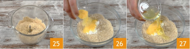 Mélangez le tout 25, puis transférez dans un bol et ajoutez la fécule de maïs et la farine de maïs fioretto 26. Enfin, incorporez aussi les blancs d'œufs 27.