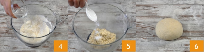 Activez le batteur plat à basse vitesse et ajoutez ensuite l'eau en filet 4. À ce stade, remplacez le batteur plat par le crochet et travaillez la pâte pendant environ 5 minutes. Ajoutez ensuite le sel 5 et travaillez encore quelques minutes jusqu'à obtenir une pâte homogène. Transférez la pâte sur un plan et donnons-lui une forme sphérique 6.