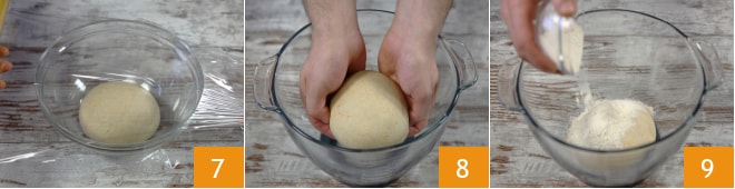 Mettez-la dans un bol, couvrez avec du film plastique 7 et laissez reposer à température ambiante environ 2 heures. Après ce temps, la pâte n'aura pas beaucoup levé, remettez-la dans le bol d'un robot pâtissier 8. Ajoutez la farine 9 et activez le crochet.