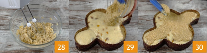 Travaillez avec les fouets électriques jusqu'à obtenir une préparation homogène et crémeuse 28. Puis étalez sur la colombe 29 en utilisant une spatule pour répartir le glaçage sur toute la surface 30.