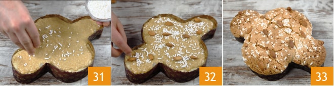 Garnissez avec du sucre en grains 31 et des amandes entières 32. Faites cuire dans un four statique préchauffé à 160°C pendant 50 minutes, puis couvrez avec une feuille d'aluminium et poursuivez la cuisson pendant encore 10 minutes. Sortez la colombe du four et laissez-la refroidir avant de la servir 33.