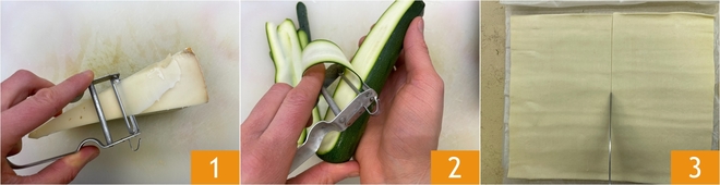 Pour préparer la colombe salée en pâte feuilletée, commencez par obtenir des copeaux fins de fontina à l'aide d'un épluche-légumes 1. Lavez les courgettes, coupez les extrémités puis taillez des bandes fines toujours à l'épluche-légumes 2. À présent, déroulez le premier rouleau de pâte feuilletée et coupez-le en deux 3.