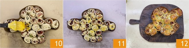 Poursuivez de la même manière avec le reste des ingrédients jusqu'à remplir le moule. Enfin, badigeonnez toute la surface avec l'œuf battu 10, en l'étalant uniformément sur tous les roulés 11. Faites cuire dans un four traditionnel préchauffé à 180 °C pendant environ 40-50 minutes, jusqu'à obtenir une belle dorure. Laissez tiédir avant de servir votre colombe salée en pâte feuilletée 12 !