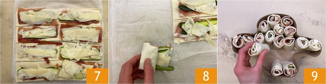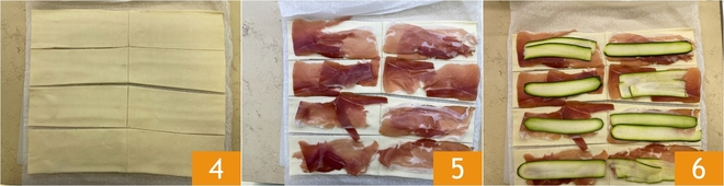 Taillez des bandes d'environ 6 cm de large, afin d'obtenir au total 8 rectangles par rouleau 4. Disposez sur chaque bande une tranche de speck 5, puis posez par-dessus une tranche de courgette 6.