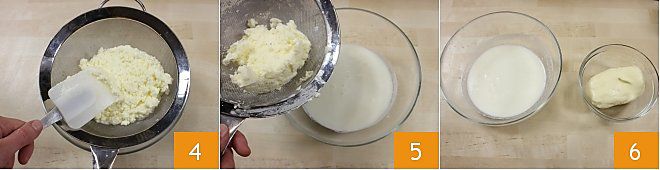 À ce stade, mettez la partie grasse dans une passoire à mailles fines et pressez-la avec une spatule pour faire sortir tout le liquide contenu 4. Compactez la partie grasse, de cette manière vous aurez obtenu le beurre, tandis que le liquide restant est le babeurre (5-6). Avec un paquet de 250 ml de crème fraîche, on obtient environ 90 g de beurre et 125 ml de babeurre.