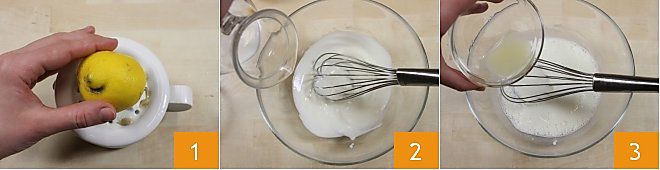 Il existe une autre version pour préparer le babeurre à la maison, sûrement plus simple et rapide, qui peut être une alternative valable au vrai babeurre. Pressez le citron, en faisant attention à filtrer les pépins 1, versez le yaourt maigre dans un bol, détendez-le à l'aide d'un fouet manuel et ajoutez le lait écrémé 2 et enfin le jus de citron 3, mélangez bien jusqu'à obtenir un mélange homogène, laissez-le reposer 10 minutes avant de l'ajouter à la préparation !