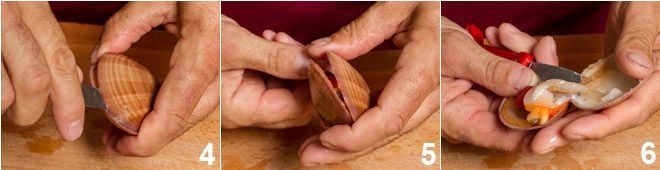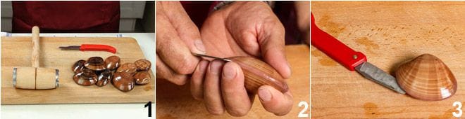 Pour nettoyer et utiliser les fasolari, vous aurez besoin d'un couteau à pointe arrondie et à lame fine et d'un petit marteau de cuisine pour attendrir la viande. Il existe deux types de fasolari : l'un avec une coquille plus claire et l'autre avec une coquille plus foncée : cependant, le goût et la consistance de la chair sont les mêmes 1. Pour nettoyer correctement les fasolari, il est nécessaire de les ouvrir en incisant les deux muscles latéraux internes. Tenez-les en veillant à placer la partie la plus courte de la coquille vers le bas dans la paume de votre main 2. Glissez la lame entre les deux valves en vous aidant de la pression du doigt. Enfoncez la pointe plate du couteau jusqu'au fond 3 et