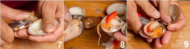 Procédez maintenant à retirer la peau grisâtre qui recouvre le fruit et le sac intestinal qui contient des petits cailloux qui, s'ils sont laissés à l'intérieur, donneront la sensation de sable dans le produit (7-8). Détachez également le fasolaro de la partie inférieure de la coquille 9. Si vous souhaitez le consommer cru, le fasolaro est prêt et, en veillant à retenir son liquide à l'intérieur de la coquille, vous pouvez l'assaisonner avec un peu de poivre ou de jus de citron.