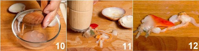 Si vous souhaitez l'utiliser cuit, après avoir recueilli dans un petit bol le liquide du mollusque 10, extrayez le fruit de la coquille et posez-le sur une planche à découper. Avec l'aide d'un petit marteau de cuisine comme celui-ci, attendrissez la chair du fasolaro, en insistant sur le pied rouge, jusqu'à ce qu'elle devienne fine, intacte et tendre (11-12).