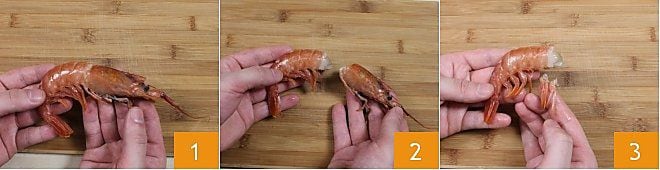 Pour nettoyer les crevettes, commencez par les rincer sous l'eau courante, puis posez-les sur une planche à découper et détachez la tête (1-2). Ensuite, utilisez vos mains pour enlever les pattes 3