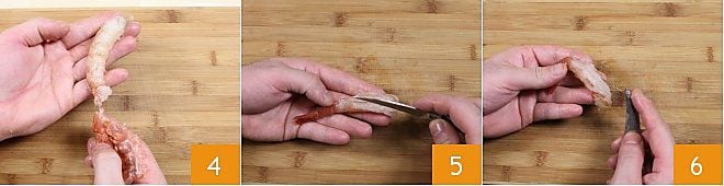 et la carapace 4, c'est-à-dire la coquille qui protège la chair. Vous pouvez décider, selon la préparation que vous envisagez, de laisser ou non la partie finale de la queue. Une fois nettoyées à l'extérieur, procédez à une opération très délicate: enlever l'intestin interne. Incisez le dos de la crevette avec un petit couteau 5 et retirez-le délicatement 6, en essayant de ne pas le casser.