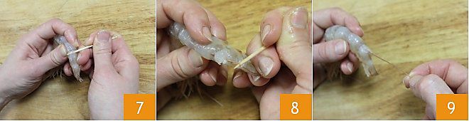Vous pouvez également effectuer cette opération avec un cure-dent: insérez-le dans la chair de la crevette 7, localisez l'intestin et tirez pour l'enlever (8-9).