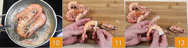 Vous pouvez aussi nettoyer les crevettes après cuisson: ébouillantez-les quelques minutes dans de l'eau bouillante, laissez-les immergées pendant 4 à 5 minutes, puis égouttez-les avec une écumoire 10; laissez-les refroidir pendant quelques minutes, puis procédez au nettoyage. Retirez la tête, les pattes et la carapace (11-12). Dans ce cas aussi, vous pouvez laisser la queue.