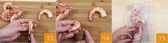 Faites une incision le long du dos et retirez l'intestin avec un cure-dent ou un couteau à lame fine. Si elles sont très fraîches, les crevettes peuvent être congelées crues ou cuites (13-14): dans ce dernier cas, laissez-les refroidir complètement, disposez-les sur un plateau et mettez-les au congélateur pour congeler 15; quand elles seront dures, placez-les dans des sacs de congélation. Lorsqu'il sera temps de les utiliser, décongelez-les au réfrigérateur la veille de leur préparation et gardez en tête de les cuire brièvement, puisqu'elles sont déjà cuites!