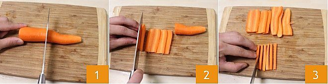LA COUPE EN BÂTONNETS Couper les légumes en bâtonnets est particulièrement indiqué pour les cuissons au wok. Pour réaliser cette coupe, on commence par celle en tranches fines. Voyons comment faire. Lavez et épluchez une carotte, puis placez-la sur une planche à découper et divisez-la en deux 1, coupez chaque moitié en tranches fines dans le sens de la longueur 2, puis coupez chaque tranche réalisée en bâtonnets d'environ 5 mm de large 3.