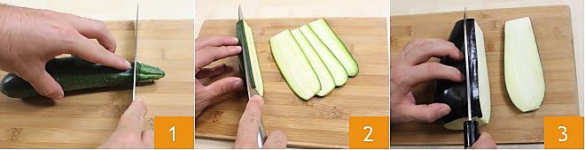 LA COUPE EN TRANCHES FINES Cette coupe est généralement utilisée pour les préparations au gril et se réalise en coupant le légume dans le sens de la fibre pour éviter que les tranches ne se désagrègent pendant la cuisson. Voyons comment faire. Lavez et séchez, par exemple, une courgette ou une aubergine, placez-les sur une planche à découper et éliminez les extrémités 1, puis avec un couteau bien aiguisé, coupez-les en tranches dans le sens de la longueur (2-3), obtenant de longues tranches fines.