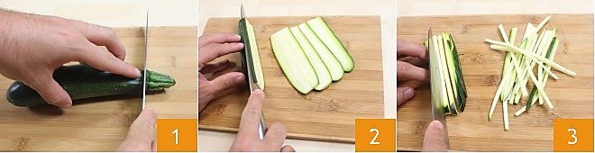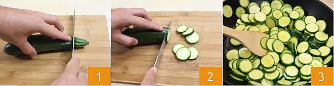 LA COUPE EN RONDELLES La coupe en rondelles est généralement utilisée pour couper les légumes ayant une forme étroite et allongée (comme par exemple les courgettes ou les concombres) et elle est idéale pour la cuisson à la poêle car l'épaisseur limitée des tranches permet une cuisson plus rapide et uniforme. Voyons comment faire. Lavez et séchez, par exemple, une courgette, placez-la sur une planche à découper et éliminez les extrémités 1, puis procédez à la couper en rondelles plus ou moins fines selon la recette que vous devez préparer 2: plus épaisses si vous devez les faire sauter à la poêle 3, plus fines si vous les utilisez pour préparer une omelette.
