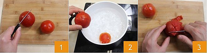 LA COUPE À CONCASSER La coupe à concasser, ou concassée, est un type de coupe qui est utilisé pour couper les légumes blanchis, en particulier la tomate. Voyons comment faire. Prenez les tomates et faites une incision en croix sur le fond de chacune d'elles 1, puis plongez-les dans de l'eau bouillante en les laissant cuire quelques secondes 2, égouttez-les et plongez-les immédiatement dans beaucoup d'eau froide pour les refroidir plus rapidement. Ensuite, retirez la peau en vous aidant d'un petit couteau, grâce à l'incision pratiquée précédemment, il sera beaucoup plus simple de les peler 3.