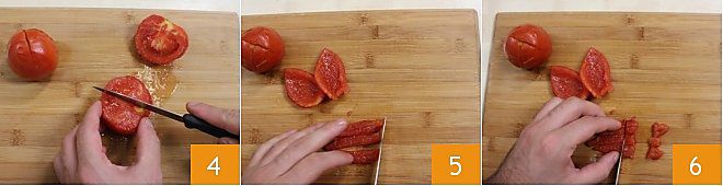 Coupez les tomates en deux puis en quartiers, éliminez ensuite toutes les graines 4. Coupez chaque tomate en lanières d'environ un demi-centimètre de côté 5. À ce stade, vous pourrez réaliser des dés 6 qui vous seront utiles pour préparer des sauces, des bruschettas ou des décorations.