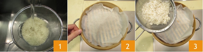 Pour préparer le riz à la vapeur, commencez par mettre sur le feu une casserole d'eau et portez à ébullition. En attendant, rincez le riz 1 et égouttez-le. Disposez une feuille de papier sulfurisé sur le cuiseur vapeur 2 et placez sur la casserole. Ensuite, transférez le riz 3 et répartissez-le sur toute la surface.