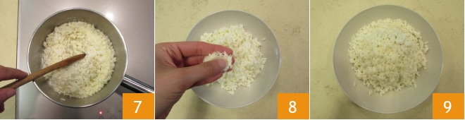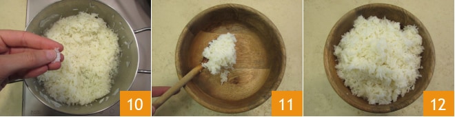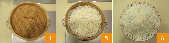 Couvrez avec le couvercle 4 et laissez cuire environ 20 minutes 5. Vous avez ainsi vu comment cuire le riz à la vapeur, dressez-le et assaisonnez avec un filet d'huile 6.