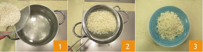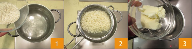 Pour préparer le riz beurre et parmesan, commencez par faire cuire le riz : versez-le dans de l'eau bouillante et salée 1 et après environ 20 minutes, égouttez-le 2. En attendant, versez le beurre dans une petite casserole 3.