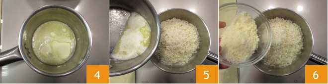 Faites-le fondre à feu très doux 4 et une fois fondu, versez-le dans la casserole avec le riz égoutté 5. Faites cuire à feu doux quelques instants jusqu'à ce que le beurre soit absorbé. À ce stade, ajoutez le parmesan râpé en en gardant un peu de côté 6.