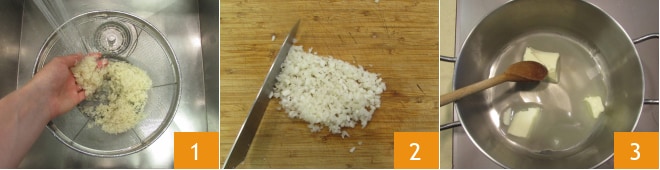 Pour préparer le riz pilaf, commencez par faire chauffer l'eau dans une petite casserole. Continuez en rinçant le basmati sous un filet d'eau 1. Égouttez-le et, en attendant, pelez et hachez l'oignon 2. Puis, faites fondre le beurre dans une petite casserole à feu doux, afin de ne pas le brûler 3.