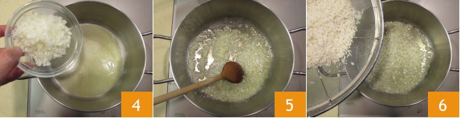 Ajoutez l'oignon 4 et laissez-le mijoter quelques minutes en remuant 5 avant de verser le riz 6.