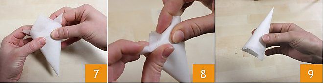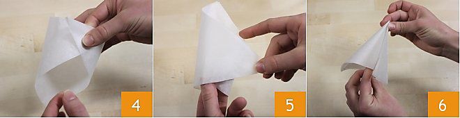 Rassemblez les deux coins de la base 4, superposez-les, enroulez les bords du papier sulfurisé sur eux-mêmes 5 et fermez jusqu'à former un cône (la pointe doit être formée par la base du triangle) 6.
