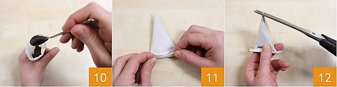 Avec une main, tenez le cornet et avec l'autre, remplissez-le 10 juste au-delà de la moitié avec, par exemple, du chocolat fondu, et une fois cette dernière opération effectuée, repliez le cône vers la pointe pour le fermer 11. Pressez légèrement le cône pour pousser le chocolat vers le bas. Vous pouvez couper la pointe en formant un trou de sortie plus large ou plus étroit selon l'utilisation que vous souhaitez en faire 12. Votre cornet en papier sulfurisé est prêt, maintenant vous pouvez vous amuser avec les décorations !