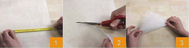 Pour réaliser un cornet avec du papier sulfurisé, dessinez avec un crayon et une règle un carré de 20x20 cm de côté 1, découpez-le 2 et pliez-le en deux pour former un triangle 3.