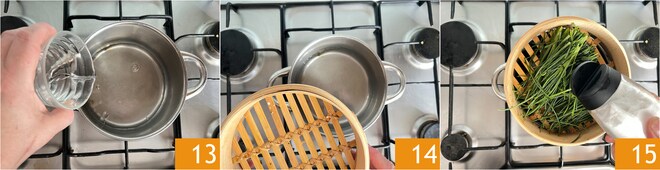 Pour cuire les agretti à la vapeur, versez un verre d'eau dans une casserole 13, placez le panier vapeur dessus 14 et disposez les agretti préalablement nettoyés à l'intérieur. Assaisonnez avec le sel 15.