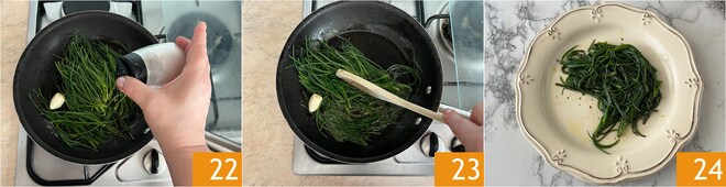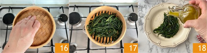 Couvrez avec le couvercle approprié 16 et laissez cuire pendant 15 minutes 17. Transférez les agretti dans une assiette et assaisonnez-les avec de l'huile 18 et une pincée de poivre noir.