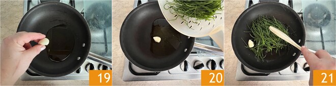 Pour cuisiner les agretti à la poêle, épluchez une gousse d'ail et placez-la dans une poêle avec un filet d'huile 19. Laissez-la dorer et ajoutez les agretti déjà nettoyés 20. Mélangez pour les parfumer 21.