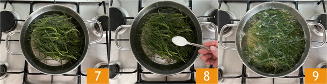 Pour bouillir les agretti, remplissez une casserole d'eau, ajoutez les agretti préalablement nettoyés, et placez-la sur le feu 7. Ajoutez le sel 8 et laissez cuire pendant 5 minutes après ébullition 9.