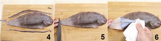 Une fois que toutes les nageoires sont éliminées, la sole se présentera comme sur la photo 4. À ce stade, passez à l'écorchement de la sole : avec l'aide d'un couteau bien aiguisé, faites une incision au-dessus de la queue, petite et peu profonde 5, en incisant la peau sombre. Vous êtes maintenant prêt à enlever la peau : saisissez fermement la queue avec une main et, avec l'autre, à partir du point où vous avez fait l'incision, arrachez la peau de la sole jusqu'à l'enlever complètement, en tirant avec force vers la tête. Comme la peau de ce poisson est très glissante, nous vous conseillons de vous aider dans cette opération en utilisant un torchon 6.