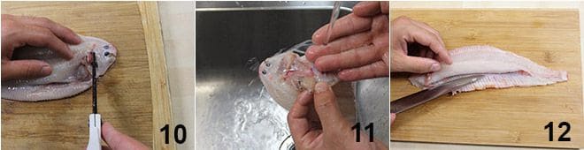 Utilisez les ciseaux pour couper les branchies à la base de la tête 10. Maintenant, lavez bien la sole sous l'eau fraîche courante pour éliminer toute impureté éventuelle ou trace de sang 11, puis passez à l'étape finale : le filetage. En utilisant un couteau à fileter le poisson, fin et flexible, faites une incision, de la tête vers la queue 12,