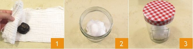 Pour conserver la truffe que vous avez achetée ou que l'on vous a offerte, vous pouvez la garder quelques jours dans un bocal en verre, parfaitement propre et sec. Pour conserver tout son parfum, il faut maintenir un degré d'humidité correct à l'intérieur. À cet effet, il est conseillé de l'envelopper, sans l'avoir encore lavée, avec de la gaze sèche et propre 1, ou avec du papier absorbant ou un morceau de tissu sans odeur de lessive. L'important est qu'elle soit enveloppée dans un matériau respirant permettant un échange d'oxygène. Placez-la ensuite dans un bocal en verre sec et propre 2, fermez le couvercle 3 et placez le bocal dans un endroit frais, même sur l'étagère la moins froide du réfrigérateur, pour environ une semaine.