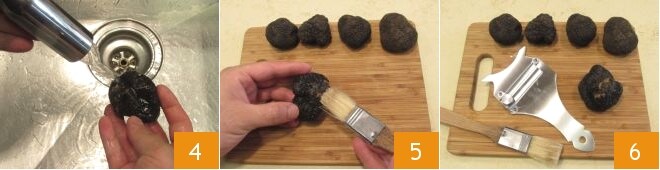 Quand viendra le moment d'utiliser la truffe dans vos préparations, si c'est une truffe noire, rincez-la sous l'eau courante froide pour éliminer l'excès de terre 4 et nettoyez-la soigneusement en retirant toutes les impuretés à l'aide d'une brosse ou d'un pinceau à poils mi-durs (si c'est une truffe blanche, vous pouvez utiliser une brosse ou un pinceau à poils très doux) 5. Une fois cela fait, la truffe sera prête à être tranchée finement avec le coupe-truffe approprié 6, pour assaisonner des pâtes, des œufs ou aromatiser de tendres filets !